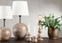 Ståtlig bordslampa med globformad fot i antikträ och lampskärm i textil.