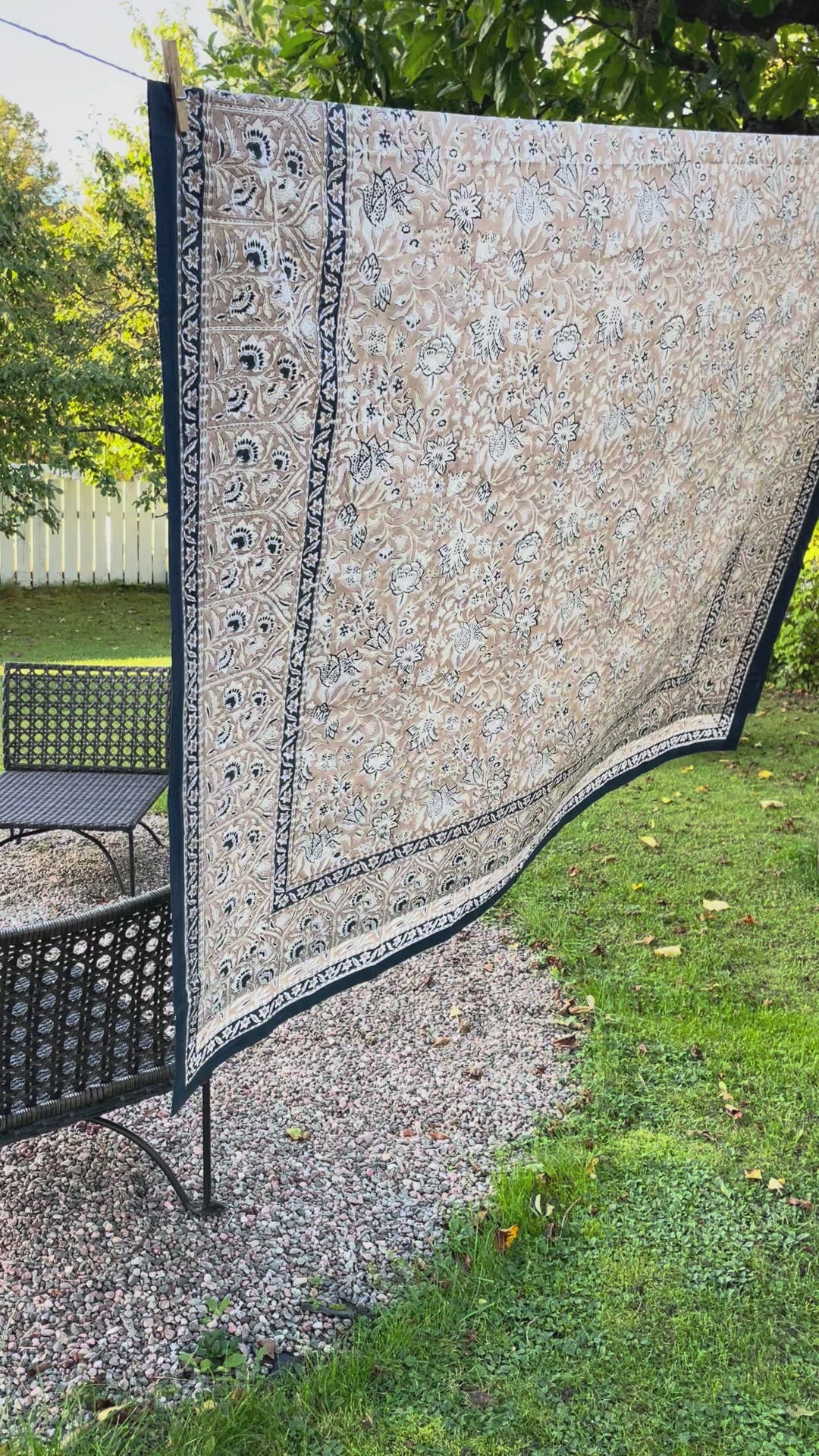 Fantastiskt fin blockprintad duk i vintagestil i vackra beige och blå toner. Duken är 155x240cm i 100% bomull. Finns bara ett fåtal.