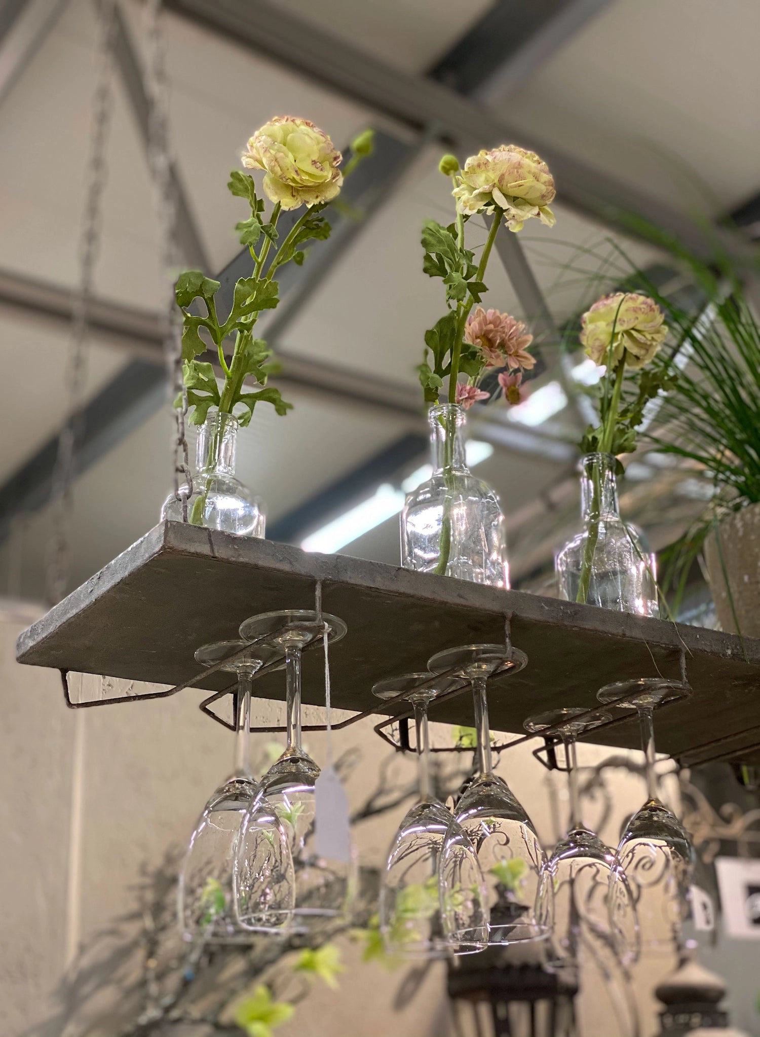 Praktisk hängande hylla i metall med krokar och hållare – perfekt i köket över en köksö.