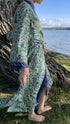 Lång kimono i återbrukad indisk sari – varje plagg är vintage och helt unikt. One size med knytband i midjan. Lätt och följsam med vackert fall, perfekt som lyxig morgonrock hemma eller stylad över klänning/jeans som festlig kimono-kavaj. Färger och mönster varierar mellan exemplaren – det är en del av charmen.
