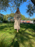 Lång kimono i återbrukad indisk sari – varje plagg är vintage och helt unikt. One size med knytband i midjan. Lätt och följsam med vackert fall, perfekt som lyxig morgonrock hemma eller stylad över klänning/jeans som festlig kimono-kavaj. Färger och mönster varierar mellan exemplaren – det är en del av charmen.