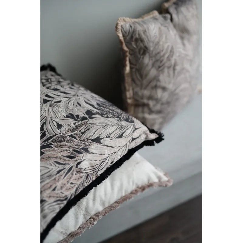 Kuddfodral med ett härligt bladmönster på, med stora, svepande former och djup i varje detalj. Runt kuddfodralet löper en nätt frans, som tillför en mjuk och sofistikerad inramning.