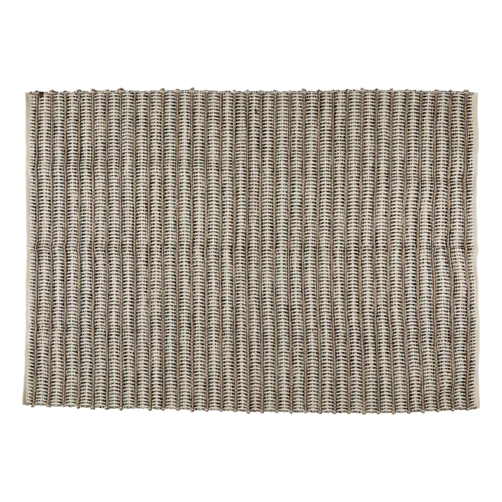 En stilren matta i harmoniska naturtoner som kombinerar grått, elfenben och naturfärg. Mattan har ett subtilt randigt mönster som ger liv och struktur utan att ta över rummet. Den passar lika bra i hallen som under soffbordet eller i sovrummet för en varm och inbjudande känsla.