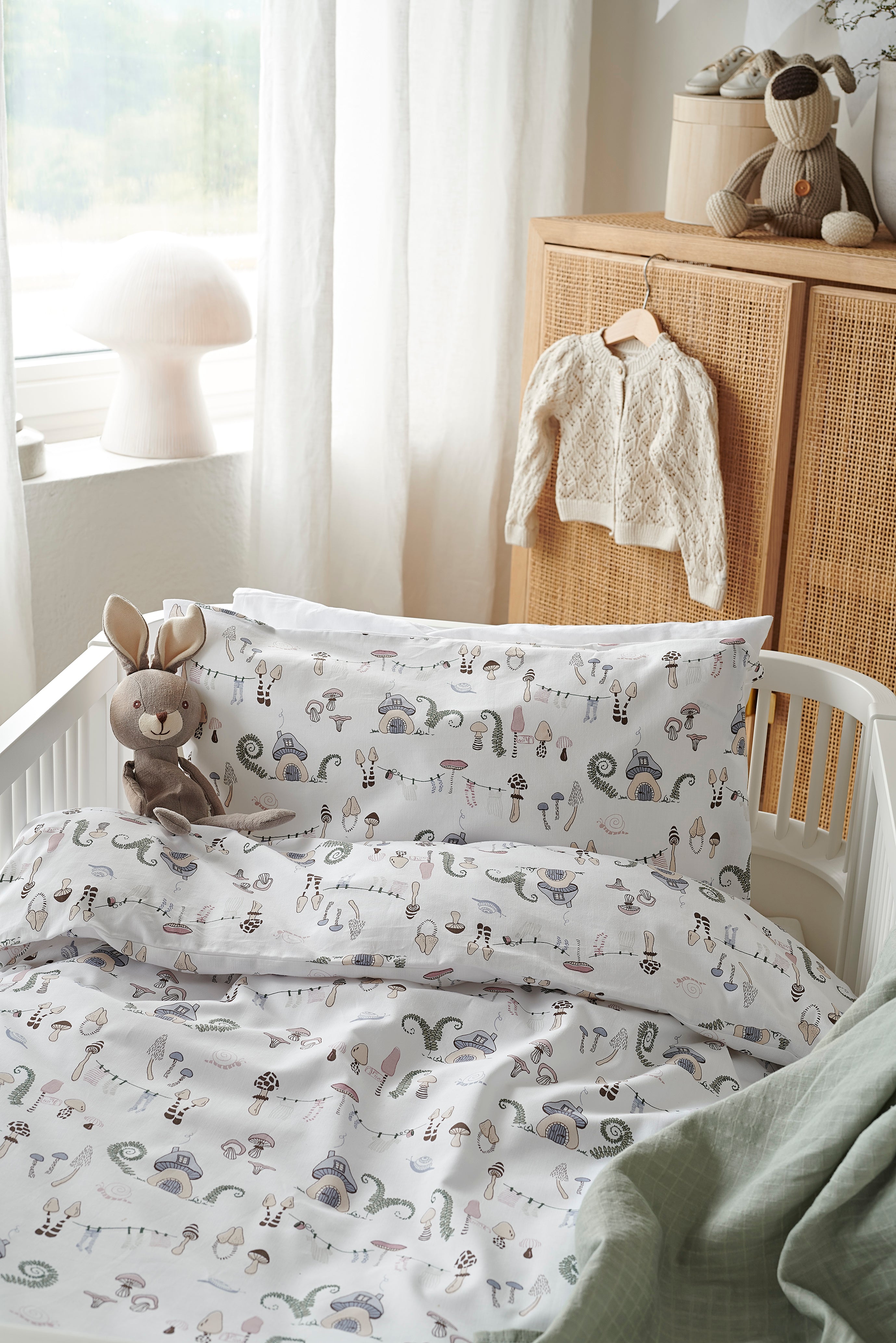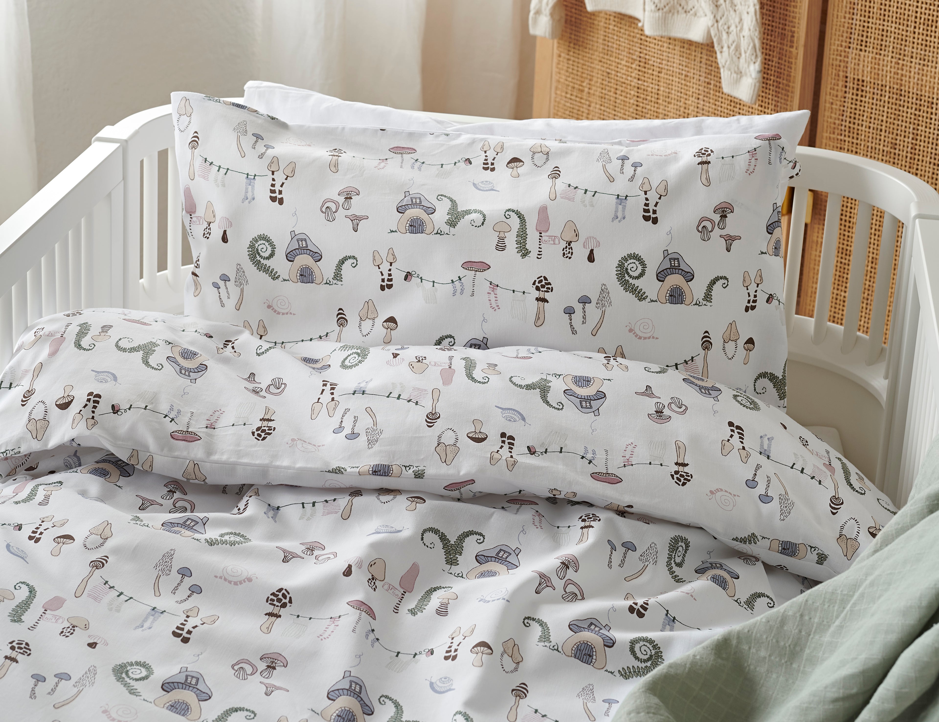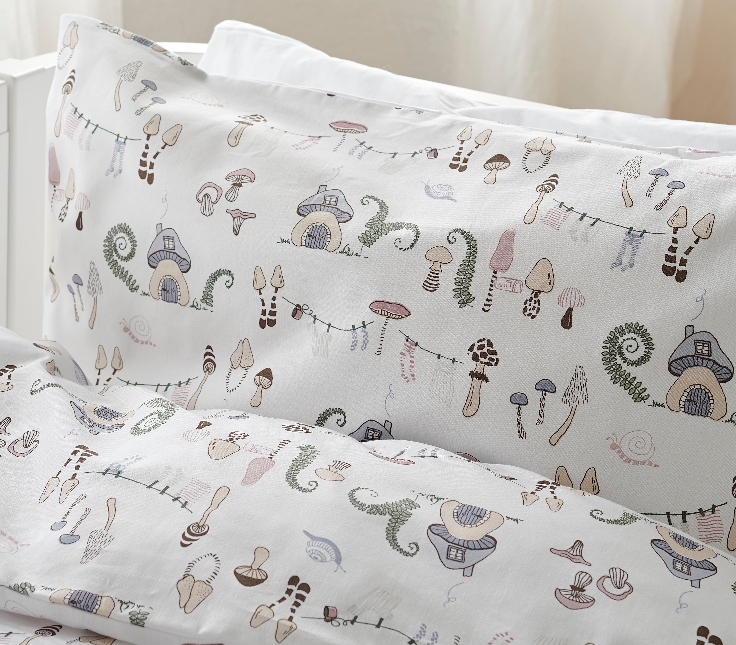 Bäddset bestående av ett örngott och ett påslakan med ett humoristiskt mönster av svampar. Passande storlek för spjälsäng och tillverkat i skön bomullskvalitet.