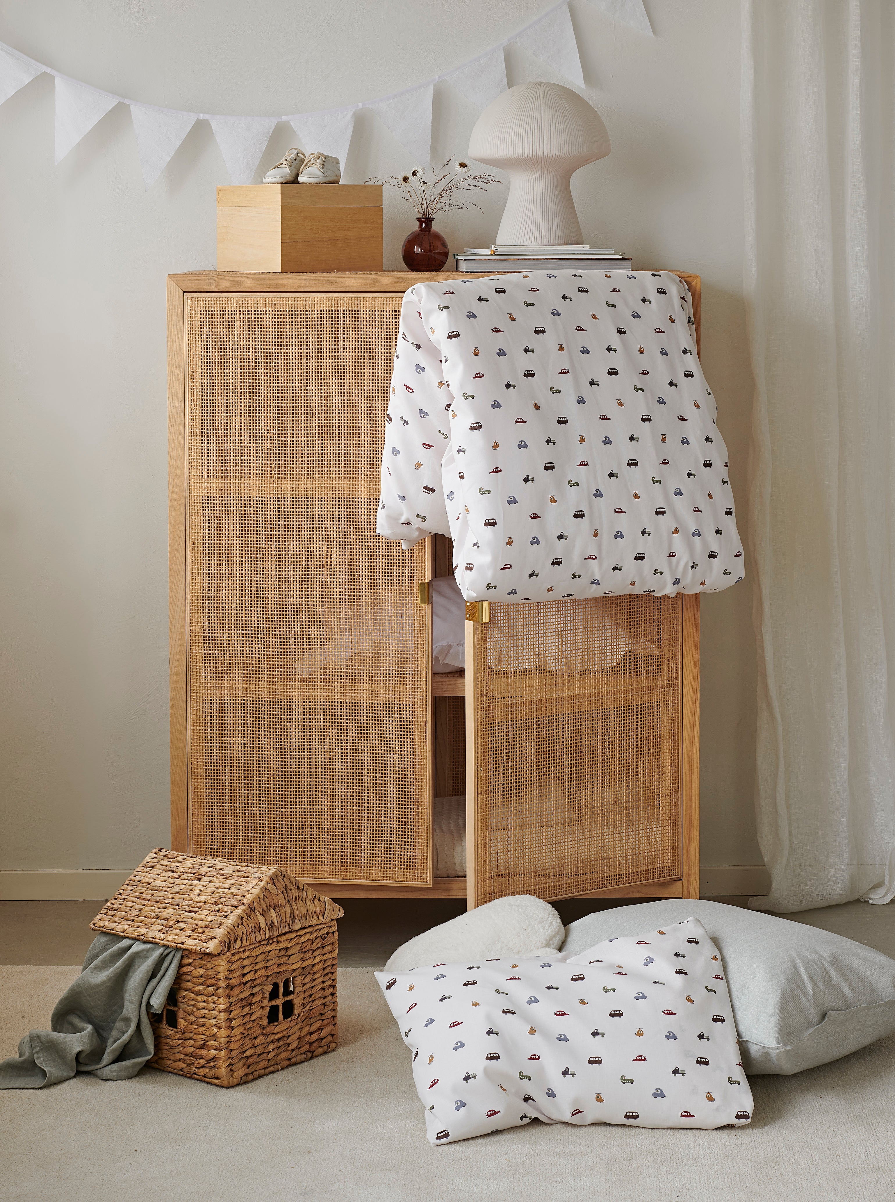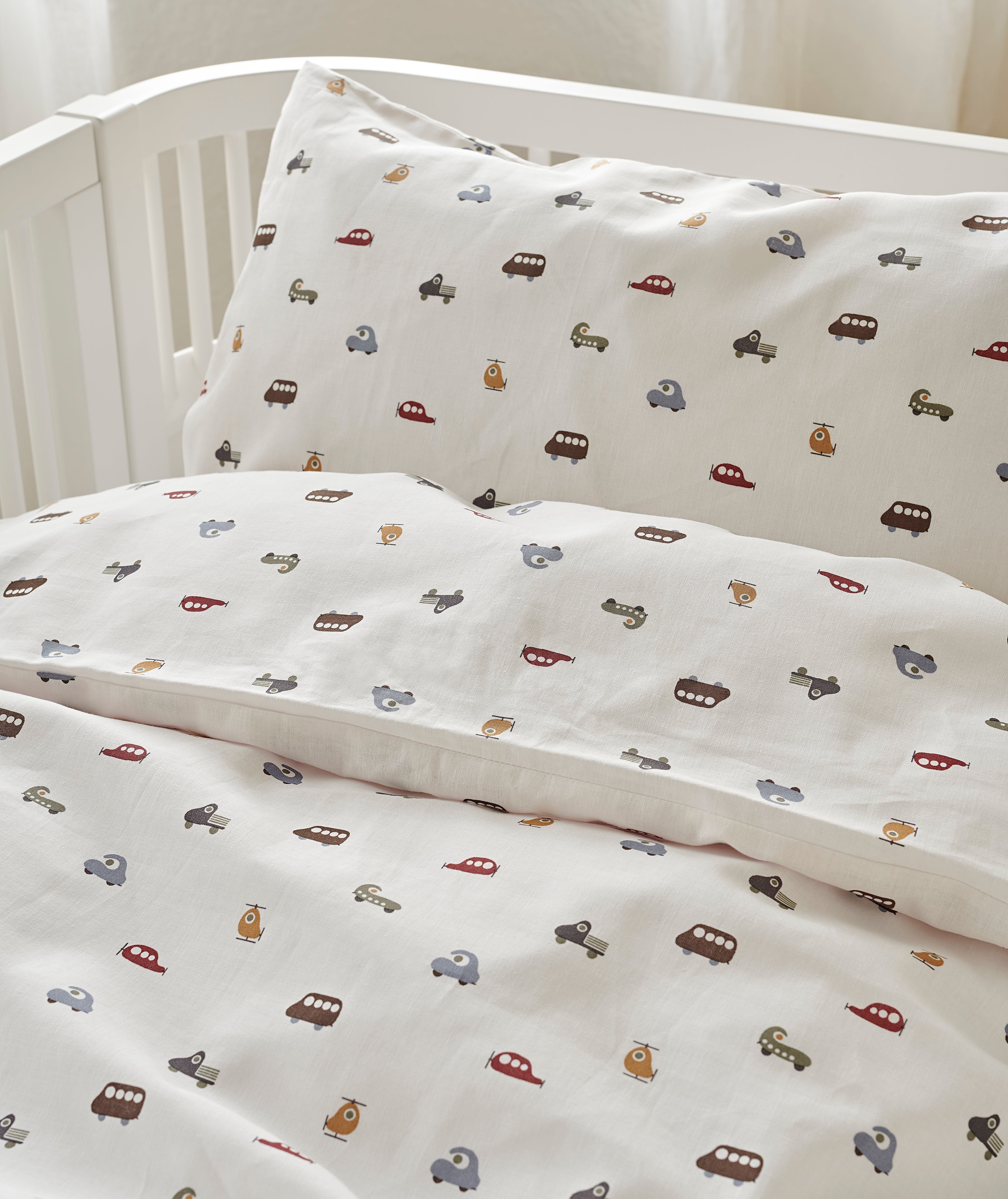 Bäddset bestående av ett örngott och ett påslakan med roligt mönster med bilar, traktorer och bussar. Passande storlek för spjälsäng och tillverkat i skön bomullskvalitet.