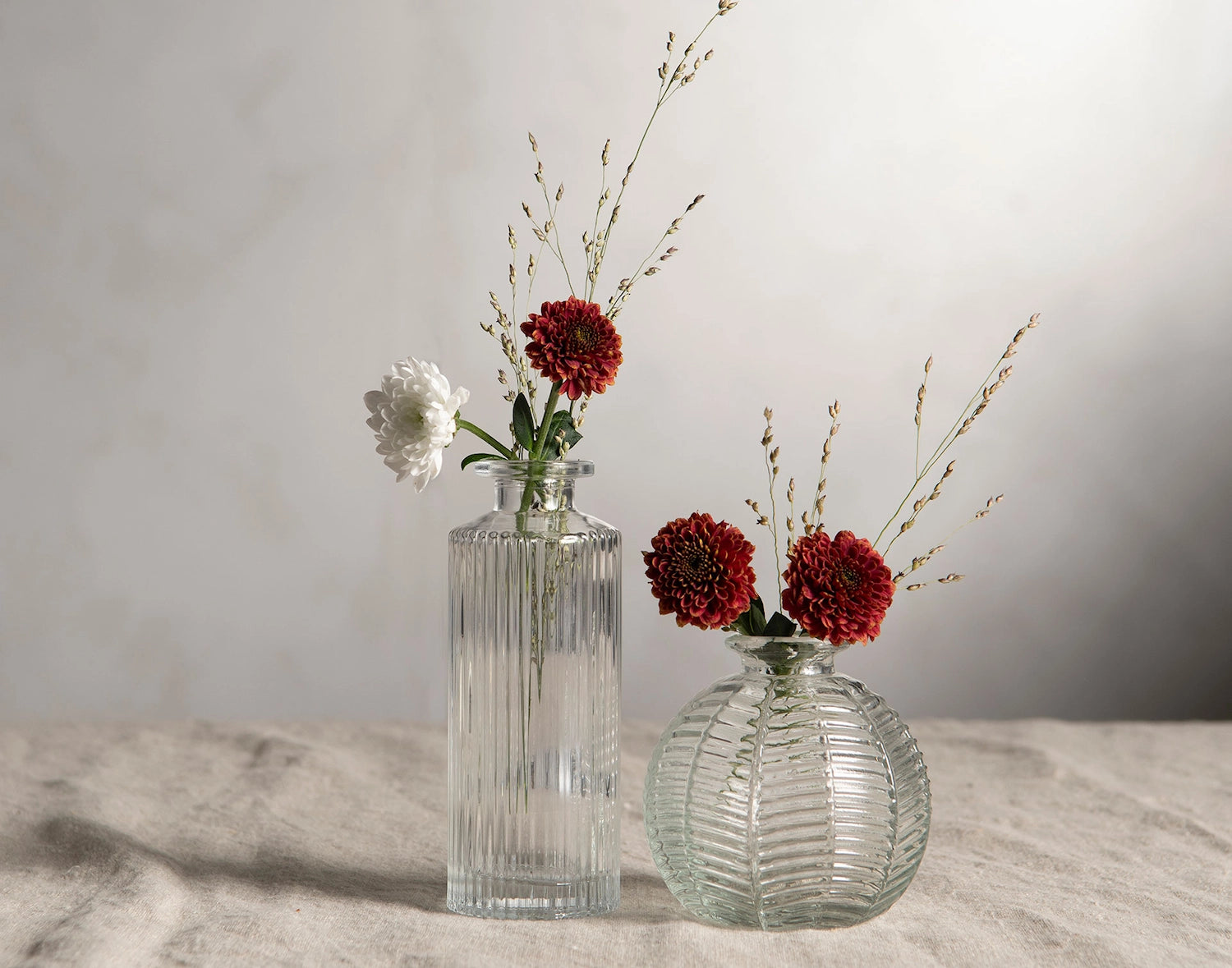 Vi älskar att använda minivaser när vi dukar upp till fest. Att använda flera minivaser på rad längs borden gör att alla gäster får njuta av blommor utan att du behöver köpa flera buketter.